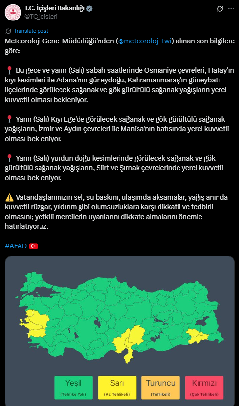 İçişleri Bakanlığı, sosyal medya üzerinden Meteoroloji verilerini paylaşarak Kıyı Ege'de beklenen yağışların yerel olarak güçlü olabileceğini duyurdu. Açıklamada, “Bugün Kıyı Ege'de görülecek sağanak ve gök gürültülü sağanak yağışların, özellikle İzmir ve Aydın çevreleri ile Manisa'nın batısında kuvvetli olması öngörülmektedir.” uyarısında bulundu.
