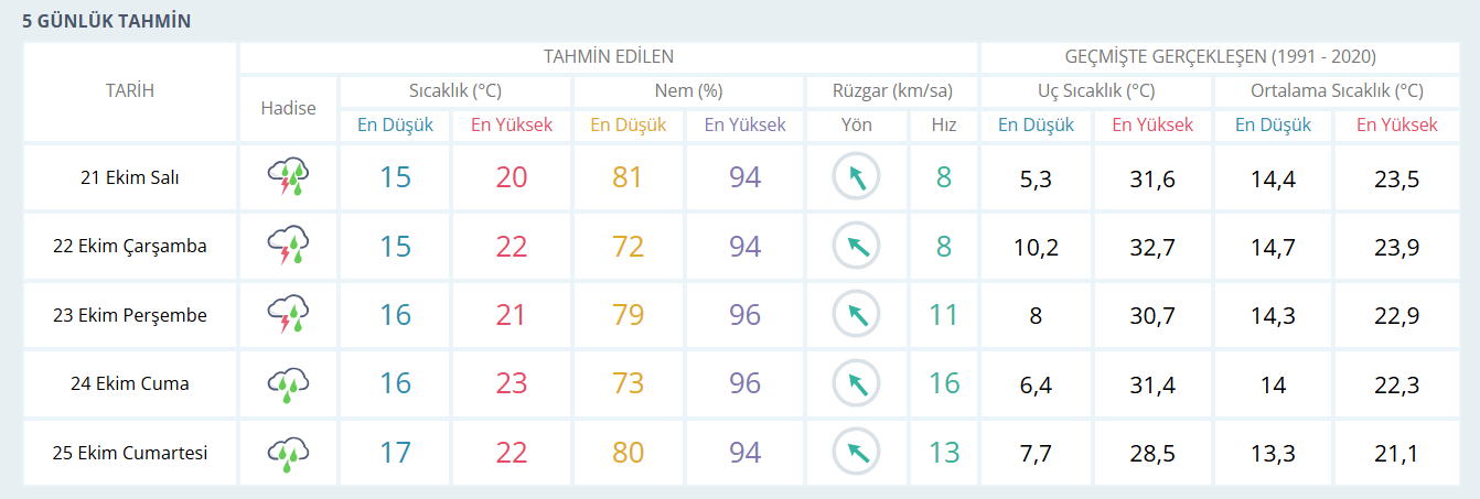 - Seferihisar: Parçalı ve çok bulutlu, sağanak ve gök gürültülü sağanak yağışlı. Yağışlar kuvvetli, 20°C