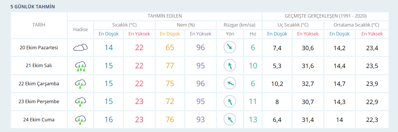 Tahminlere göre 20 Ekim Pazartesi günü İzmir'de hava sıcaklığı 22 derece olacak ve gece saatlerinden itibaren birçok ilçede yağışlar başlayacak. 21 Ekim Salı günü sağanak yağışlar devam edecek iken sıcaklık 22 derece civarında kalacak. 22 Ekim Çarşamba günü de yağışların etkisi sürecek. 23 Eylül Perşembe günü sıcaklığın 23 dereceye yükselebileceği, ancak yağışlı havanın etki alanında olacağı bekleniyor. 24 Ekim Cuma günü ise şehir genelinde yağışların devam edeceği belirtiliyor.