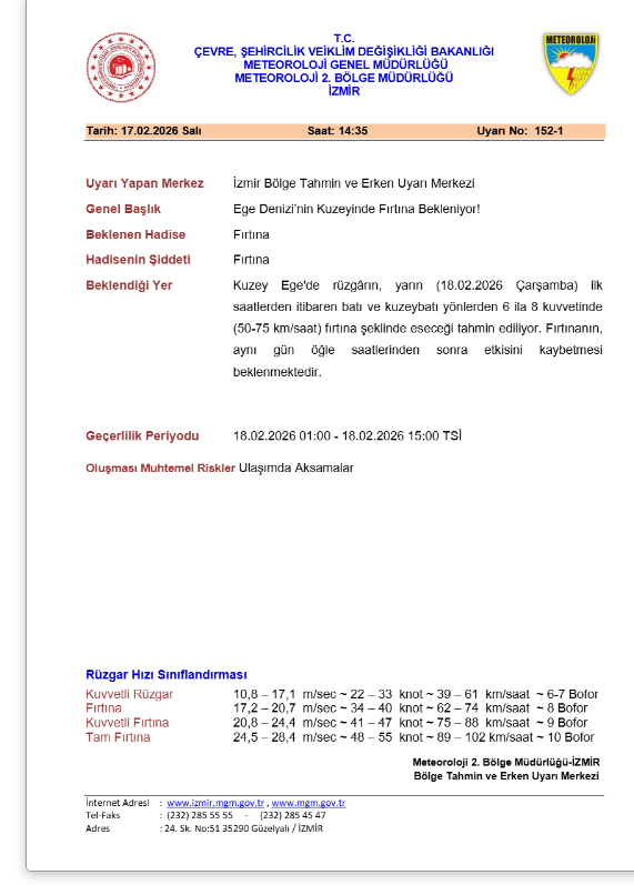 Fırtınanın, aynı gün öğle saatlerinden itibaren etkisinin azalacağı öngörülüyor. Tahminlere göre, kuvvetli rüzgarın gün boyunca zayıflaması bekleniyor. Meteoroloji, geçerlilik periyodunu 18.02.2026 01.00 – 18.02.2026 15.00 olarak açıkladı.