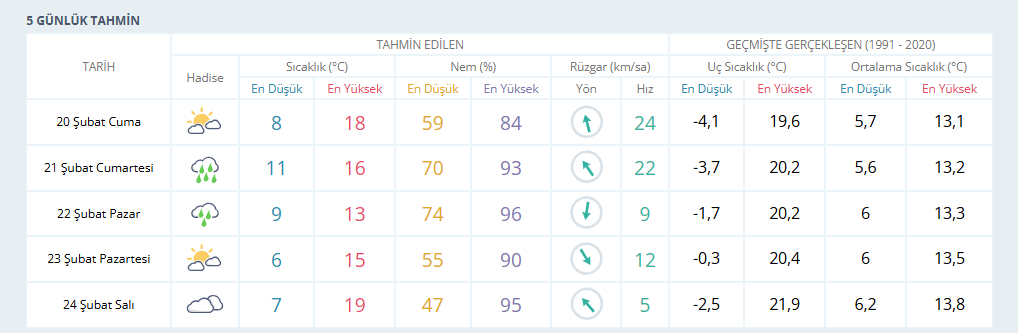 Meteoroloji verilerine dayanarak, İzmir'de 20 Şubat Cuma günü genel olarak bulutlu bir hava bekleniyor. Bazı ilçeler için şiddetli yağış uyarısı yapılırken, sıcaklık gün içinde 18 dereceye kadar çıkması tahmin ediliyor. 21 Şubat Cumartesi günü sağanak yağışların etkili olması ve sıcaklığın 16 derece civarında seyretmesi öngörülüyor. 22 Şubat Pazar günü ise yağışlı bir havanın hâkim olması ve sıcaklığın 13 derece dolaylarında olacağı belirtiliyor.