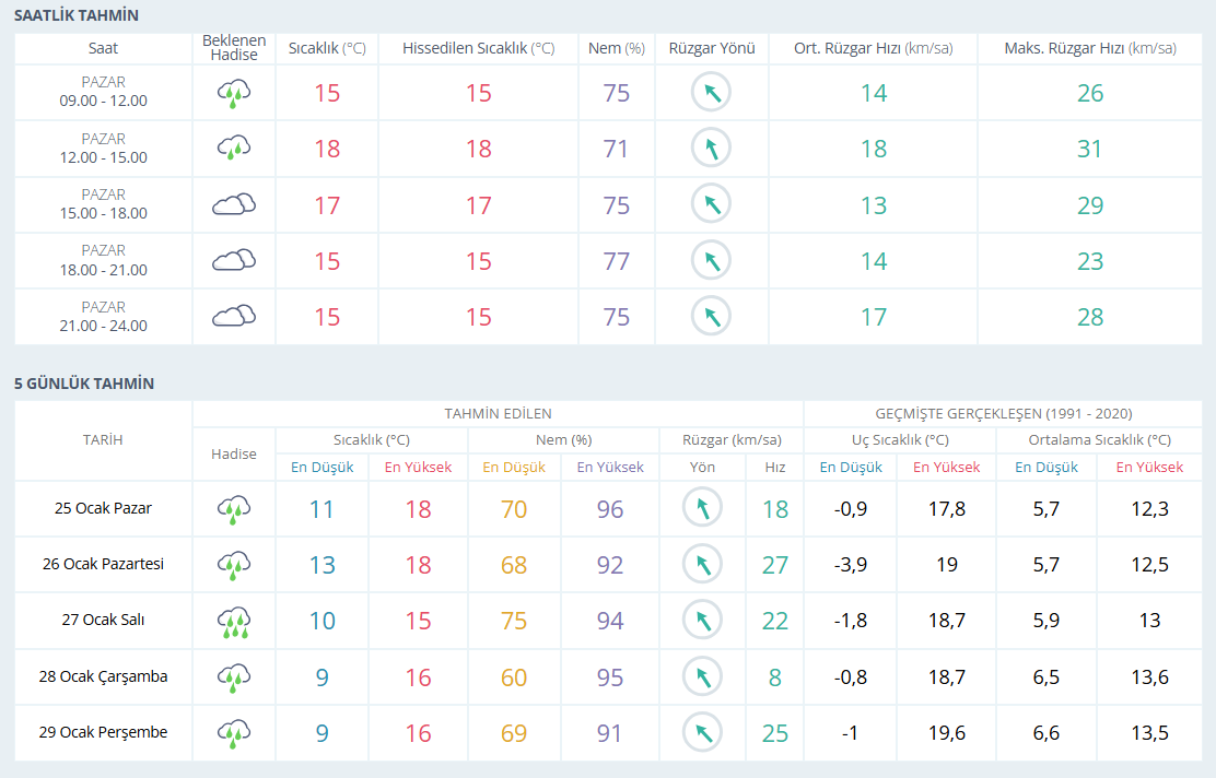 • Konak: 18°C, parçalı ve çok bulutlu, sabah saatlerinde aralıklı hafif sağanak yağışlı