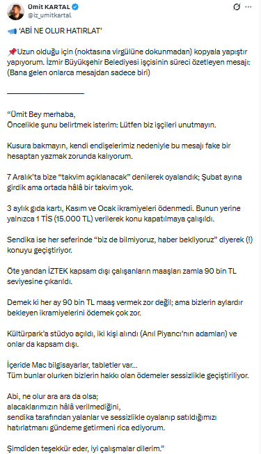 “Ümit Bey merhaba, Öncelikle şunu belirtmek isterim: Lütfen biz işçileri unutmayın. Kusura bakmayın, kendi endişelerimiz nedeniyle bu mesajı fake bir hesaptan yazmak zorunda kalıyorum. 7 Aralık’ta bize 'takvim açıklanacak' denilerek oyalandık; Şubat ayına girdik ama hâlâ bir takvim yok. 3 aylık gıda kartı, Kasım ve Ocak ikramiyeleri ödenmedi. Bunun yerine yalnızca 1 TİS (15.000 TL) verilerek konu kapatılmaya çalışıldı. Sendika ise her seferinde 'biz de bilmiyoruz, haber bekliyoruz' diyerek (!) konuyu geçiştiriyor. Öte yandan İZTEK kapsam dışı çalışanların maaşları zamla 90 bin TL seviyesine çıkarıldı. Demek ki her ay 90 bin TL maaş vermek zor değil; ama bizlerin aylardır bekleyen ikramiyelerini ödemek çok zor. Kültürpark’a stüdyo açıldı, iki kişi alındı (Anıl Piyancı’nın adamları) ve onlar da kapsam dışı. İçeride Mac bilgisayarlar, tabletler var… Tüm bunlar olurken bizlerin hakkı olan ödemeler sessizlikle geçiştiriliyor. Abi, ne olur ara ara da olsa; alacaklarımızın hâlâ verilmediğini, sendika tarafından yalanlar ve sessizlikle oyalanıp satıldığımızı hatırlatmanı gündeme getirmeni rica ediyorum. Şimdiden teşekkür eder, iyi çalışmalar dilerim.”