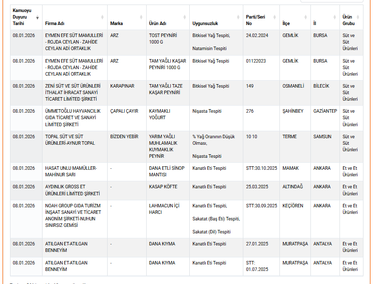 Tarım ve Orman Bakanlığı tarafından güncellenen listede sadece zeytinyağında değil, et ve süt ürünlerinde de farklı uygunsuzluklar tespit edildi.