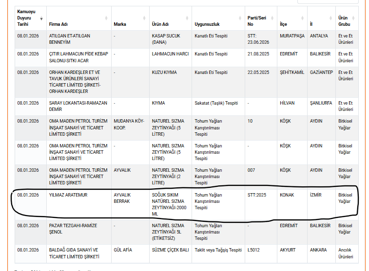 Güncellenen ifşa listesine göre, İzmir’in Konak ilçesinde yer alan bir işletmeye ait ürün incelemeye alındı. YILMAZ ARATEMUR markalı AYVALIK BERRAK isimli Soğuk Sıkım Natürel Sızma Zeytinyağı 2000 ml ürününde tohum yağları karıştırıldığı belirlendi. Söz konusu ürün, Tarım ve Orman Bakanlığı’nın 8 Ocak 2026 tarihli taklit ve tağşiş gıdalar listesinde yer aldı.