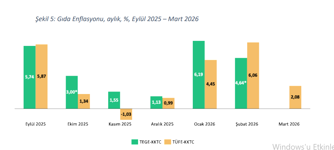 KKTC Gıda Fiyat Endeksi (KKTC-TEGE) kapsamında 1-25 Mart 2026 dönemine ait verilerle aylık gıda enflasyonu yüzde 2,08 olarak hesaplandı. Yüksek seyreden iki ayın ardından gıda enflasyonunun yeniden düşüş eğilimine girdiği görüldü.