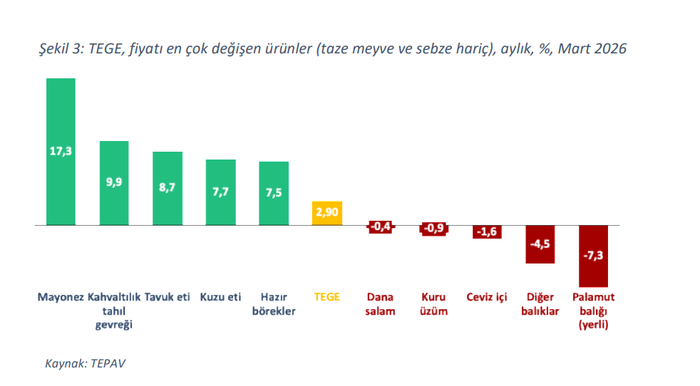 Taze meyve ve sebze dışı kategoride ise en belirgin fiyat artışları mayonez, kahvaltılık tahıl gevreği ve tavuk etinde gerçekleşti. Aynı dönemde palamut balığı (yerli), diğer balıklar ve ceviz fiyatlarında ise düşüş tespit edildi.