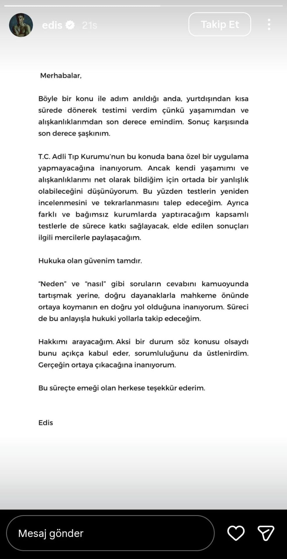 Edis, hakkındaki gelişmelerin ardından sosyal medya hesabından yazılı bir açıklama yaptı.