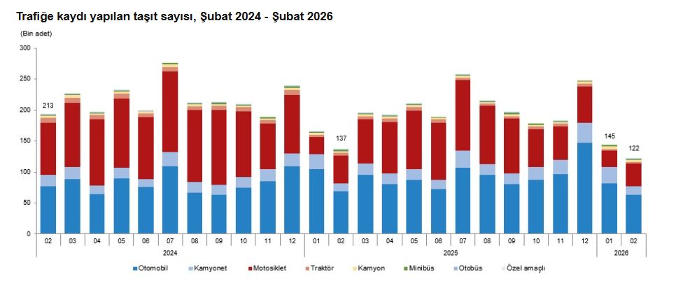 Şubat ayında trafiğe kaydı yapılan taşıtların %51,9'unu otomobil, %30,3'ünü motosiklet, %11,7'sini kamyonet, %2,5'ini kamyon, %1,7'sini traktör, %1,1'ini minibüs, %0,7'sini otobüs ve %0,1'ini özel amaçlı taşıtlar oluşturdu.