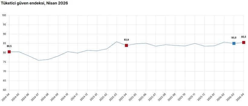 Buna göre mart ayında 85,0 seviyesinde bulunan tüketici güven endeksi, nisan ayında yüzde 0,5 artarak 85,5'e çıktı. Böylece endekste önceki aya göre sınırlı bir toparlanma gözlendi.
