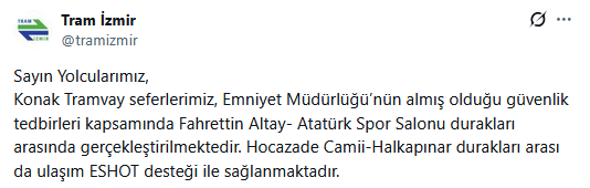 Sayın Yolcularımız, Konak Tramvay seferlerimiz, Emniyet Müdürlüğü’nün almış olduğu güvenlik tedbirleri kapsamında Fahrettin Altay- Atatürk Spor Salonu durakları arasında gerçekleştirilmektedir. Hocazade Camii-Halkapınar durakları arası da ulaşım ESHOT desteği ile sağlanmaktadır.