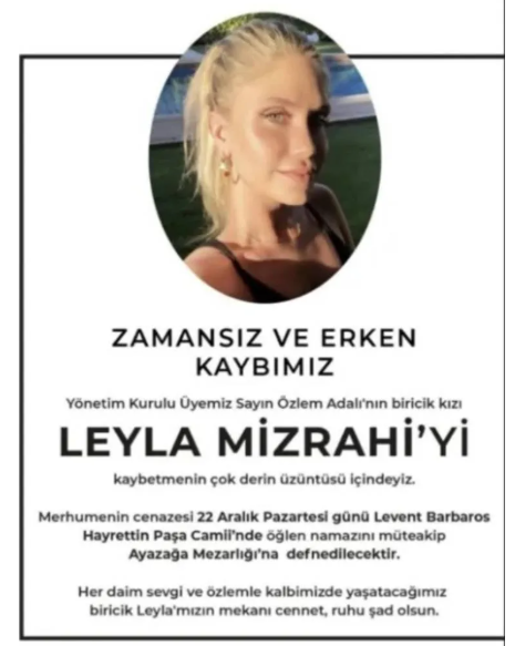 Ailesi, Leyla Mizrahi’nin vefatından duydukları derin üzüntüyü dile getirdiği bir taziye ilanı yayınladı. İlanda, “Zamansız ve erken kaybımız Yönetim Kurulu Üyemiz Sayın Özlem Adalı'nın Leyla Mizrahi’yi yitirmenin derin üzüntüsü içindeyiz. Her daim sevgi ve özlemle kalbimizde yaşatacağımız Leyla’mızın mekânı cennet, ruhu şâd olsun” ifadelerine yer verildi.