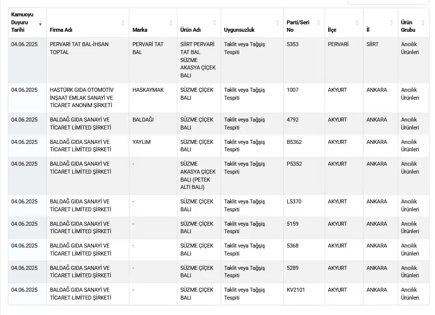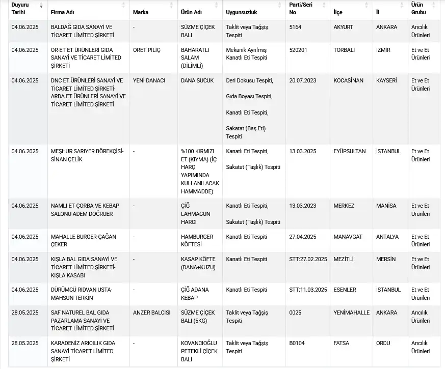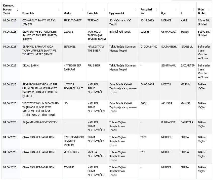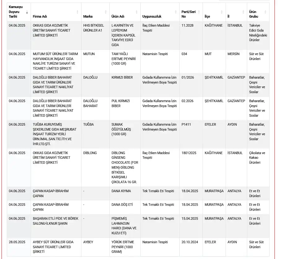 Sağlığı tehdit eden gıdalar arasında HHS Bitkisel Ürünler markalı takviye gıda, Mutun markalı eritme peyniri, Daloğlu markalı kırmızı biber ve Tuğba kuruyemiş markalı sumak gibi ürünler yer alıyor.