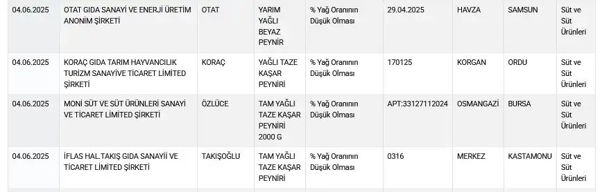 Temel özellikleri etkileyen içerik eksikliği listesi de güncellendi. Bu listede OTAT marka yarım yağlı beyaz peyniri, KORAÇ marka kaşar peyniri, Özlüce marka kaşar peyniri ve Takışoğlu marka taze kaşar peyniri bulunuyor.