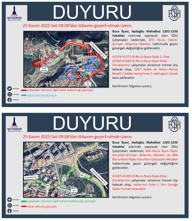 İzmir Büyükşehir Belediyesi’ne bağlı ESHOT Genel Müdürlüğü, Buca Aydoğdu Mahallesi’ndeki İZSU çalışmaları dolayısıyla bazı hatların güzergahlarında geçici düzenlemeler yapılacağını duyurdu. Duyuruya göre, bu değişiklikler 25 Kasım 2025 Salı günü saat 09.00’dan itibaren geçerli olacak.