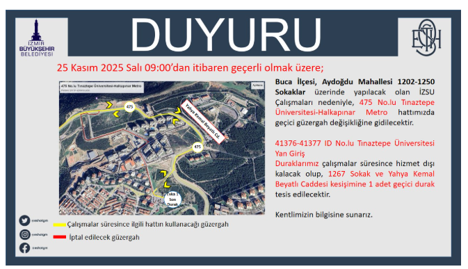 İzmir Büyükşehir Belediyesi’ne bağlı ESHOT Genel Müdürlüğü tarafından yapılan açıklamada, Aydoğdu Mahallesi 1202–1250 Sokaklar üzerinde gerçekleştirilecek çalışmalar nedeniyle 475 Tınaztepe Üniversitesi–Halkapınar Metro, 866 Buca Toplu Konutları–Şirinyer Aktarma Merkezi, 869 Buca Toplu Konutları–Üçkuyular Meydan ve 874 İzkent–Şirinyer Aktarma Merkezi hatlarının geçici olarak farklı güzergahlara yönlendirileceği belirtildi. Yolcuların sefer planlamalarını bu değişiklikler doğrultusunda yapmaları gerekiyor. İşte güncellenen rotalar: