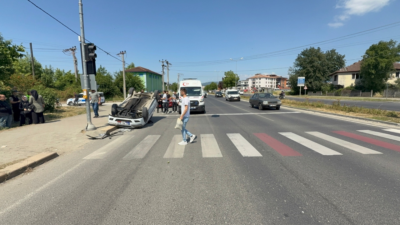 Düzce’nin Bahçeşehir bağlantı yolunda gerçekleşen zincirleme trafik kazasında, yaya geçidinde bekleyen bir otomobile arkadan çarpan araç takla attı.