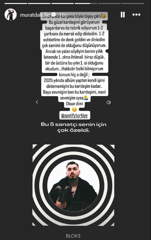 Ünlü sanatçı Murat Dalkılıç, 2025 Spotify özetini sosyal medya platformunda paylaşarak, bu duruma ilişkin dikkat çekici bir eleştiride bulundu. Dalkılıç, yıl içerisinde en çok dinlediği sanatçının Blok3 olarak bilinen rapçi Hakan Aydın olduğunu öğrenince şaşırdığını dile getirdi. Paylaşımında hem bu duruma olan şaşkınlığını hem de sitemini ifade etti.