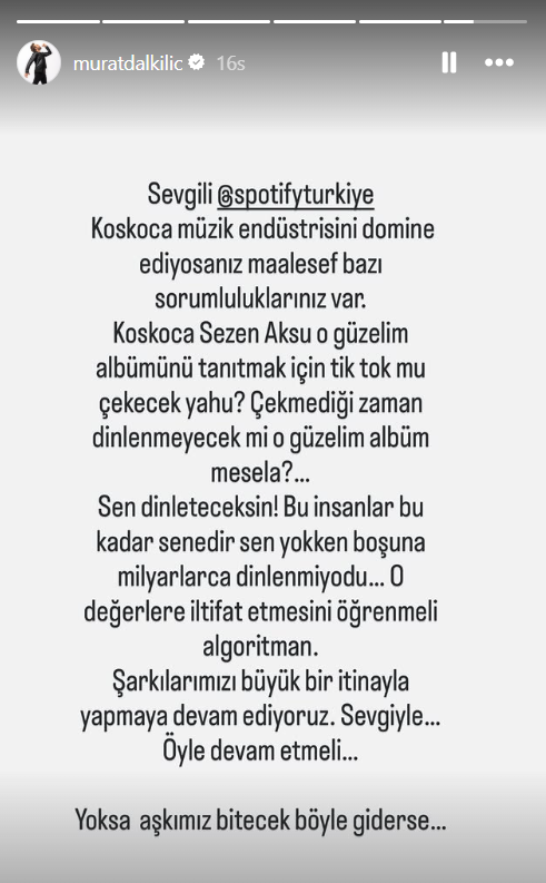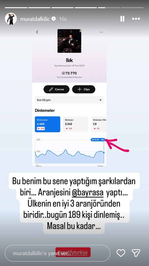 Dalkılıç, bu yıl çıktığı Ilık adlı şarkısının dinlenme sayısından da memnuniyetsizliğini dile getirdi. “Bu benim bu sene yaptığım şarkılardan biri… Bugün 189 kişi dinlemiş… Masal bu kadar…” diyerek Spotify algoritmasına göndermede bulundu.