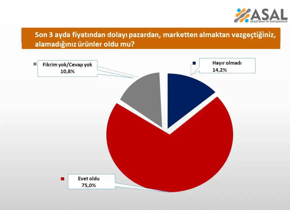 Araştırmadaki en çarpıcı detaylardan biri ise yükselen fiyatlara karşı yurttaşın alışveriş davranışları oldu. Ankette “Son 3 ayda fiyatından dolayı pazardan, marketten almaktan vazgeçtiğiniz, alamadığınız ürünler oldu mu?” sorusuna verilen yanıtlar da yüksek enflasyon gerçeğini özetledi. Ankete göre yurttaş en ucuz ve en temel ürünleri bile almaktan çekinir hale geldi.