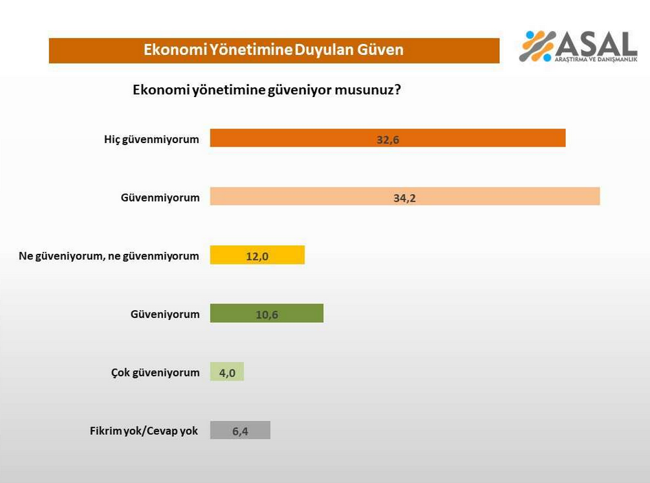 Gazete Pencere'nin haberine göre ASAL, anketinde yurttaşlara “Ekonomi yönetimine güveniyor musunuz?” sorusu yöneltti. Katılımcıların yüzde 34,2’si “güvenmiyorum”, yüzde 32,6’sı ise “hiç güvenmiyorum” yanıtını verdi.